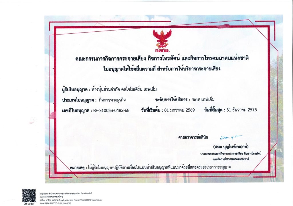 สถานีวิทยุ ดลใจเรดิโอ FM 106.50 Mhz จังหวัด อุทัยธานี. สนใจติดต่องาน โทร : 094-563-3594 รับฟังผ่านมือถือ กดที่นี่ เบราว์เซอร์ของคุณไม่รองรับการเล่นเสียง จำนวนผู้เข้าใช้งานเว็ปไซด์ สถานีของเรา “เสียงเดียวที่คนอุทัยธานีไว้วางใจ — ให้ธุรกิจคุณเติบโตไปพร้อมกัน.” ABOUT US ที่ทำการสถานี สนใจติดต่อโฆษณา โทร : 094-563-3594สถานี ดลใจเรดิโอ FM 106.50 Mhz จังหวัด อุทยธานีเลขที่ 19/4 ม.1 ต.ดงขวาง อ.หนองข่าหย่าง จ.อุทัยธานี. กดโทรเลย !!! บริการของเรา? ลงโฆษณา สินค้า บริการ หรือกิจกรรมของคุณให้ดังทั่วอุทัยธานี ด้วยทีมผลิตสปอตมืออาชีพจากดลใจเรดิโอ เราเขียนสคริปต์ อัดเสียง ตัดต่อ ครบจบที่เดียว โทร 094-563-3594 ติดต่อเรา โทรเลย 094-563-3594